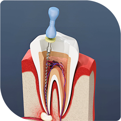The cleaned canals are filled with a biocompatible, rubber-like material called gutta-percha and then sealed to prevent re-infection.