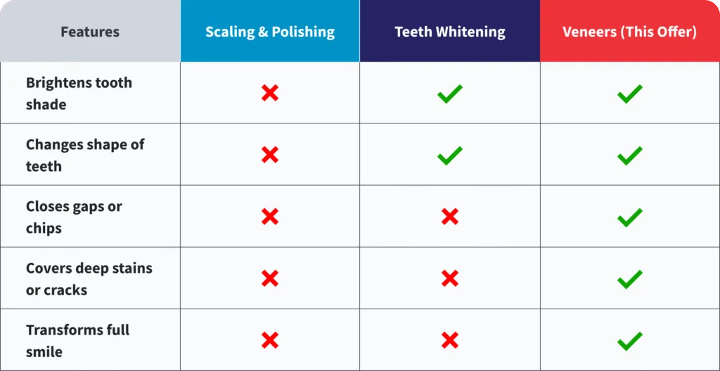 Whitening only enhances color. Veneers redefine everything — shape, size, alignment, and symmetry.